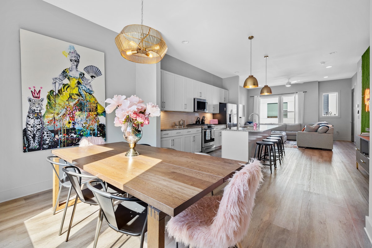 ★GUEST FAVORITE★ ★PET FRIENDLY★ ★DOLLY’S DREAMHOUSE★ ★SUPERHOST★ ★ Private Rooftop with City Skyline Views! ★ 3 Suites (2 with King Beds) ★ 9 Beds But Sleeps 14 Easily, 4 Baths ★ Attached 2-Car garage ★ Pet Friendly ★Floor-plan 1st Floor: Bedroom Suite 1 (Queen, 2 Twins) plus Futon, Private Bath. 2 Car Garage 2nd Floor: Kitchen, Dining Room, Living Room, Half Bath, Convertible Chair/Twin bed 3rd Floor: 2 King Bedroom Suites, Each w/Private Bath, Twin Bunk Beds (Hallway nook)