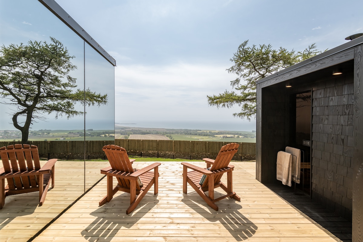 You won’t forget your time in this romantic, memorable place. Situated in the scenic North East Fife with close proximity to St Andrews, Home of Golf. The View at Lahill Craig is nestled privately on the hillside, where the relaxing surroundings blend with the grass hill and skyline to produce stunning views from the floor to ceiling glass or from the sauna, cold outdoor shower and outdoor seating area. This combines to create a thoroughly relaxing experience.