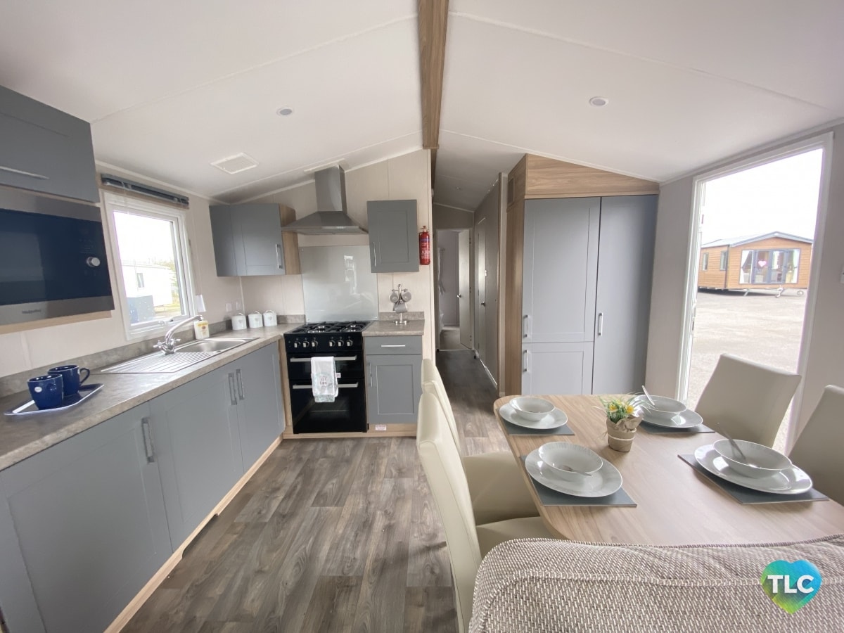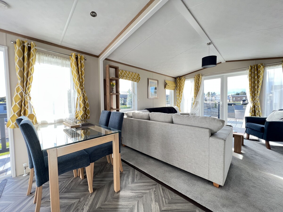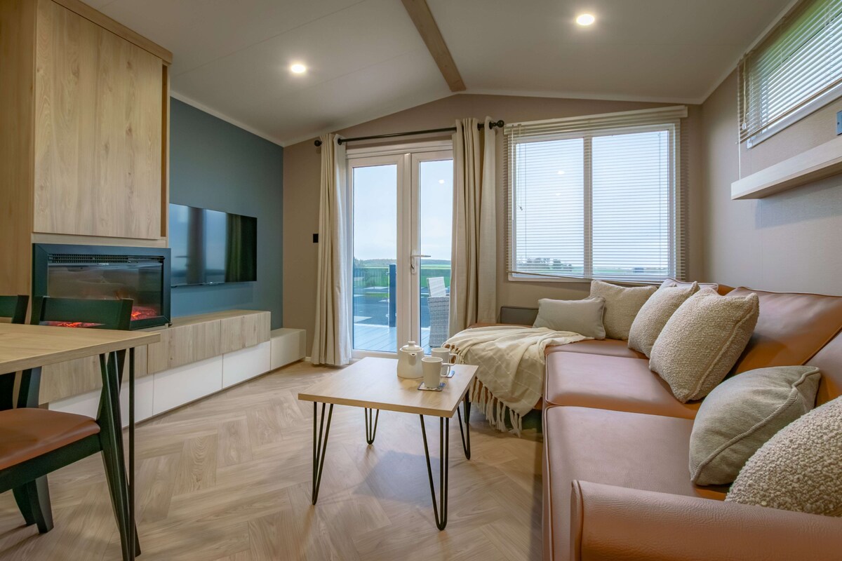Relax and admire the beauty of nature through the expansive patio doors whilst enjoying cooking in the open plan kitchen or a conversation at the breakfast bar. The modern sleek kitchen with a mirrored kitchen backsplash is a perfect backdrop to the lounge which includes an L shaped sofa bed and matching storage footstool and armchair. The wall mounted fire, dining chairs and bar stools work perfectly with the comfortable seating. The lovely lighting throughout can be adjusted to suit your taste