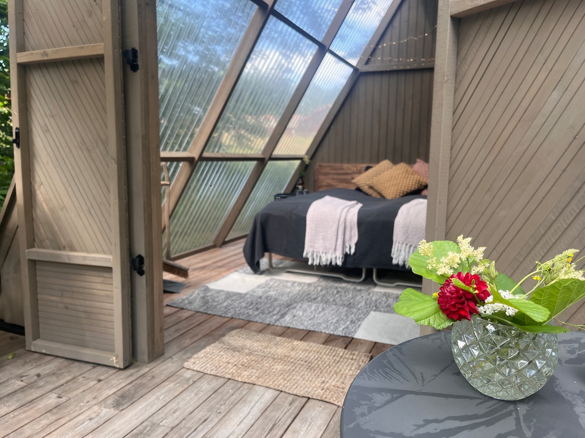 Unik A-frame bland trädtopparna i skogen - ett enkelt liv i högsta grad. Upptäck harmonin i vår förtrollande skog, inbäddad bland naturens skönheter, där varje dag känns som ett med naturen. Njut av vind och väsen från naturen till den sprakande kaminen. Laga din mat över grill eller kokplatta. Total avkoppling från allt annat som haft betydelse! Här laddar du om batterierna till fullo. Enkel toalett och dusch ca 90 meter ifrån. Endast dusch under sommaren. Max plats för 2 personer.