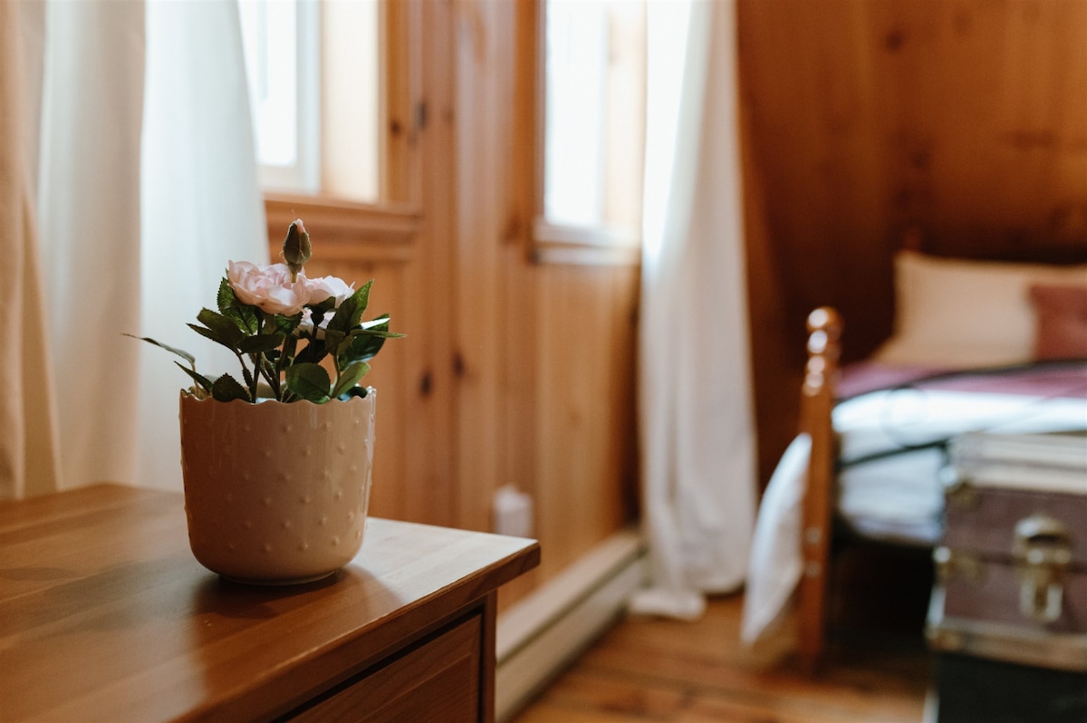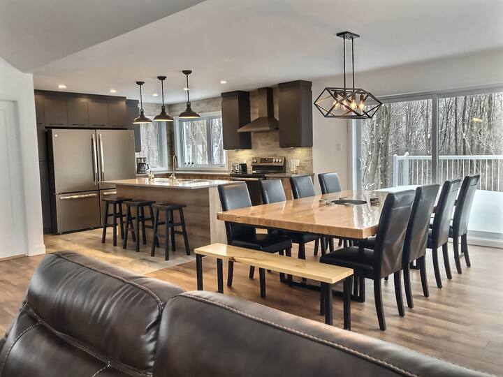 Monumental open concept, in the heart of nature. Access to trails directly behind the house. Wood stove, large modern bathroom, one bedroom + sofa bed. Another sofa bed in the living room. Ideal chalet for a couple with children or two couples. Wild birds, turkey, and deer lovers welcome! Wifi and EV charger included. Dogs Welcome! CITQ : #308038