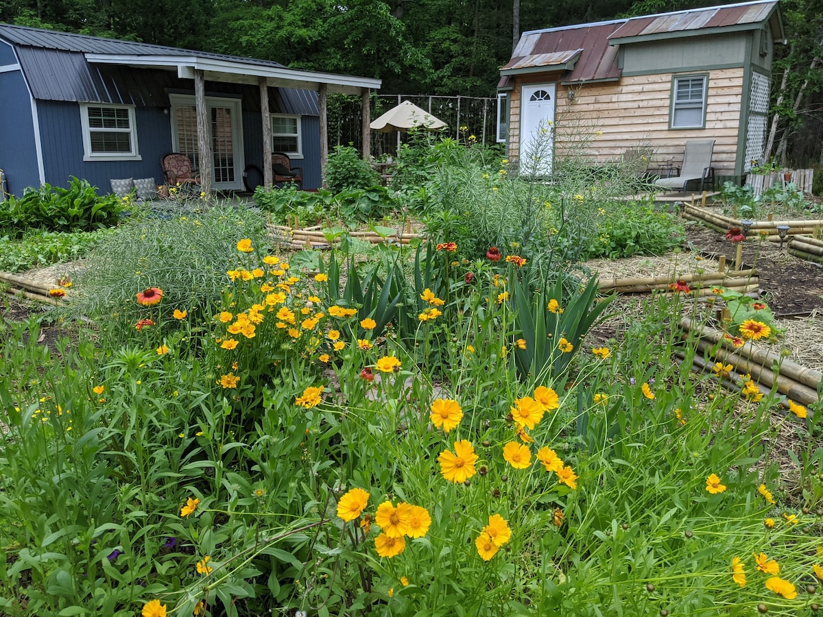 숲속에 자리한 평화로운 휴양지로 떠나보세요. 농장 동물과 야생 조류의 멜로디가 마음을 달래줄 것입니다. 세련되고 아늑한 방갈로에는 조용한 사색을 즐길 수 있는 세 개의 매력적인 현관이 있습니다. 사용하기 쉬운 실내 퇴비 화장실을 즐겨보세요. 재생 사우나(+$40)를 즐기고 정원과 나무가 늘어선 길을 거닐어 보세요. 마을과 I-40 고속도로와 가까운 이 숙소는 자연의 고요함과 세심한 생활에 흠뻑 빠져 회복할 수 있는 휴양지를 약속합니다.