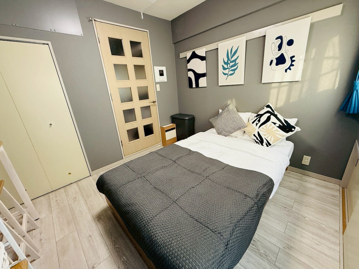 시부야와 롯폰기에서 단 한 정거장 거리에 있는 조용하고 미니멀한 로프트로, 혼자 여행하는 여행자나 집중적인 원격 근무에 적합합니다. 빠른 와이파이, 에어론 의자, 컴팩트한 더블 침대(150×210cm)가 특징입니다. 1인용으로 이상적이며, 2인용으로 아늑합니다. 유리 욕실과 세련된 콘크리트 벽이 현대적인 분위기를 연출합니다(참고: 겨울에는 응축이 발생할 수 있으니 욕실 환풍기를 켜주세요). 벽장은 없지만 넉넉한 크기의 여행 가방 4개를 수납할 수 있으며, 옷걸이와 벽에 걸 수 있는 고리 10개가 있어 물건을 깔끔하게 정리할 수 있습니다. 세탁 서비스는 주 단위로 제공됩니다.