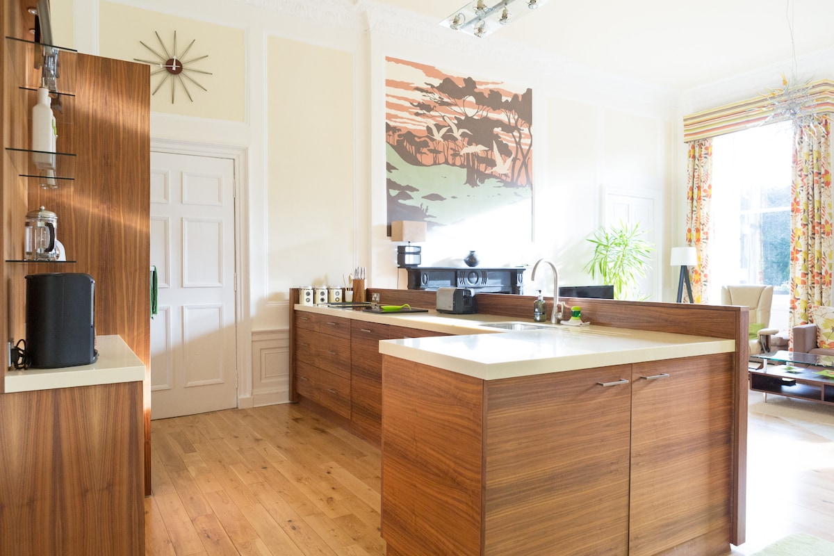 에딘버러의 세련된 웨스트 엔드에 위치한 고급스러운 현대식 아파트로, 프린세스 스트리트와 캐슬, 두 기차역, 에딘버러의 모든 것에서 도보로 몇 분 거리에 있습니다. 등급 A 등재된 조지아 타운하우스의 정원 층 전체를 구성하는 이 아파트는 넓고 멋있게 장식되어 있으며 대형 전용 야외 정원과 노외 주차장이 있습니다. 마을의 모든 곳까지 걸어서 갈 수 있을 만큼 가깝지만 아름답고 조용합니다. 요청 시 여행용 아기 침대와 유아용 식탁 의자를 제공합니다.