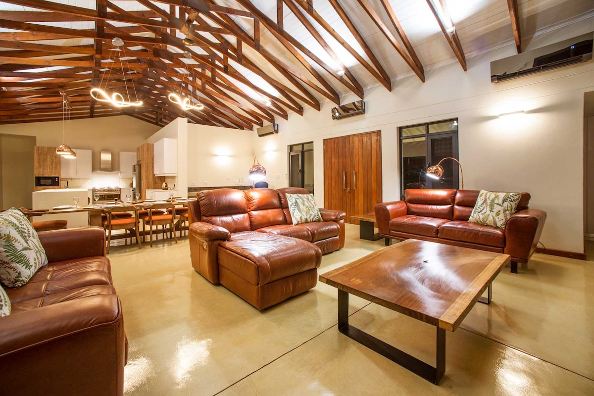 이 독특한 숙소는 개성 넘치는 스타일을 자랑합니다. 마를로스 공원의 크루거 국립공원과 경계를 이루는 수풀 한가운데에 자리한 현대적인 A자형 주택입니다. 이 독특한 숙소는 현대적이고 자연스러운 아름다움이 조화를 이루는 특별한 경험을 약속합니다. 이 숙소는 높은 천장과 커다란 창문 덕분에 자연 채광이 가득하여 쾌적한 분위기를 연출합니다. 깔끔한 라인과 밝은 인테리어가 현대적인 디자인을 정의하여 편안하고 세련된 휴식을 제공합니다.