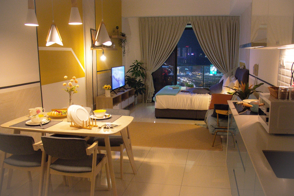 This 1 Br apartment comes with a breathtaking view of KL skyline. It has a 3-seaters sofa living room, dining table, kitchen, desk and a big balcony facing the KL Tower & Petronas Twin Towers. It comes with a 55” TV, Hi-Speed WIFI and a Queen size bed that can fit you comfortably. *The other unit of this Dual Key apartment is a compact Studio with Queen size bed, pantry, washroom & bath. It can fit in friends who travel with you with privacy. Welcome to ask for more details!