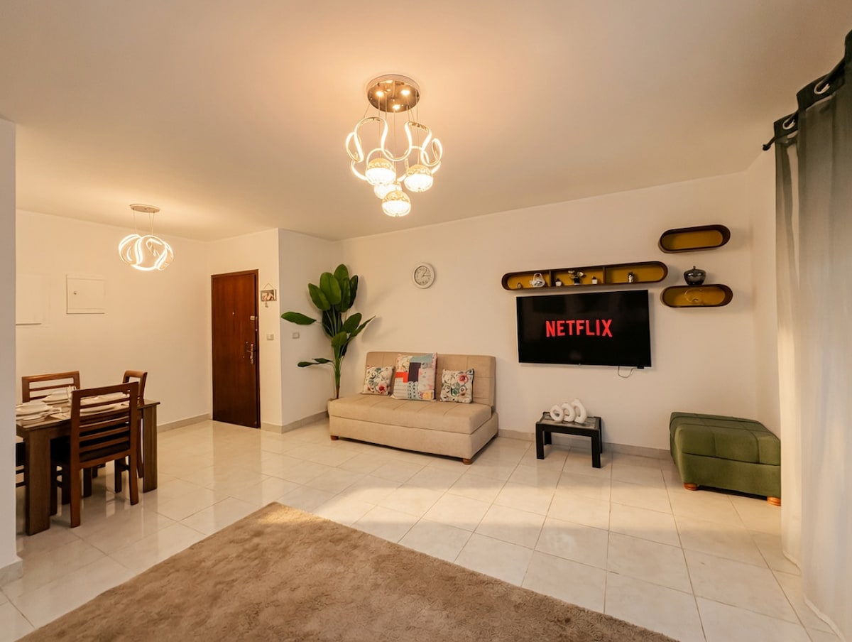 뉴 카이로의 현대적인 휴양지에 오신 것을 환영합니다! 이 아늑한 침실 2개의 아파트는 조용하고 안전한 게이트 부지에 자리 잡고 있습니다. 가족, 출장자 또는 편안함과 스타일을 즐기고 싶은 모든 사람에게 완벽한 숙소입니다. 카이로 페스티벌 시티 몰에서 단 몇 분 거리에 위치하고 있으며, 상점, 레스토랑, 카페에 쉽게 접근할 수 있습니다. 출장, 레저, 가족 휴가를 위해 방문하든, 이 아파트는 편안함, 프라이버시, 편리함이 완벽하게 어우러진 숙소입니다.