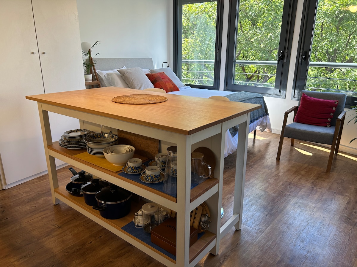 Diseño con vista al Parque y al Mar en el mejor lugar de Punta Carretas Este Estudio es ideal para descansar y disfrutar mientras visitas Montevideo. A corta distancia de restaurants, bares, shopping center y el club de golf. Aire acondicionado, Wi-Fi, Netflix, Prime video, Nespresso® con cápsulas incluidas, colchón premium, toallas de algodón, sábanas de algodón de alto conteo de hilos. Auto check-in y acceso permanente durante su estadía con la cerradura inteligente Yale® Smart lock.