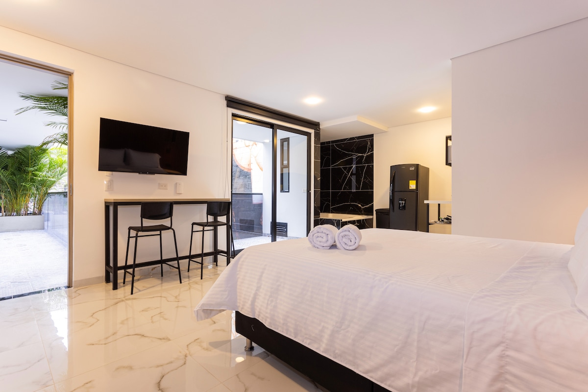전용 스카이라인 자쿠지, 킹사이즈 침대, 에어컨, 숨막히는 도시 전망을 갖춘 이 독점적인 스튜디오에서 메데인에서 즐거운 시간을 보내세요. 우아함, 편안함, 활기찬 나이트라이프를 즐길 수 있는 최고의 휴양지입니다. 엘 포블라도에 위치하고 있으며, 프로벤자의 레스토랑, 루프탑 바, 카페, 갤러리에서 몇 걸음 거리에 있으며, 레라스 공원 나이트라이프가 몇 분 거리에 있습니다. 넷플릭스가 구비된 54인치 스마트 TV, 초고속 와이파이 업무 공간, 주방, 세탁기/건조기, 헬스장, 사우나, 수영장, 구내 바, 레스토랑, 갤러리를 즐겨보세요.