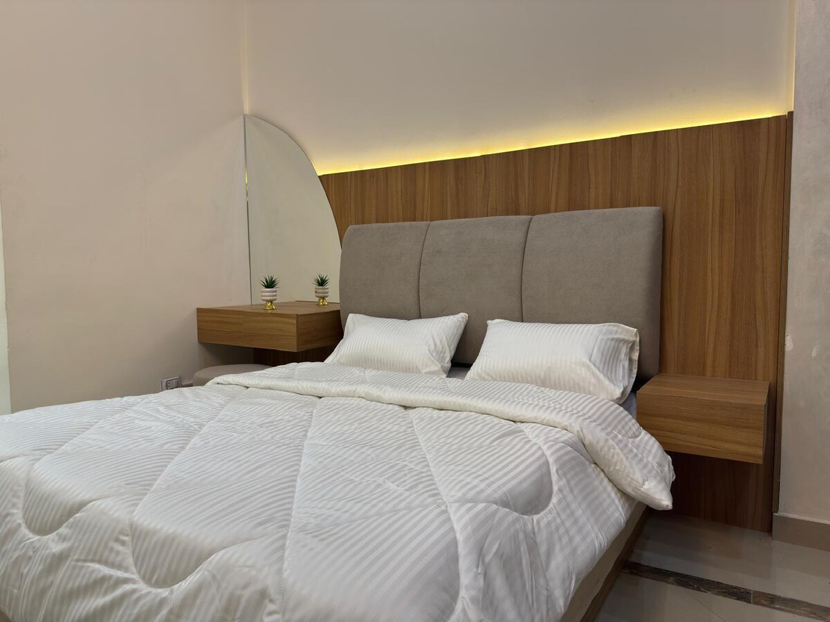 Designed by Mohamad Ali Designs. A brand new apt In Rehab city beside rehab club and gate 20 luxurious 1-bedroom hotel apartment offers the perfect combination of comfort, style, and relaxation. Suites 3 persons with one king bed and a sofa bed is provided with interior automation shutters for window. Netflix , OSN, Watch it, Anghami, and Shahid accounts are included. Enjoy your journey in an ultra modern apartment with a Jacuzzi retreat. Ground floor