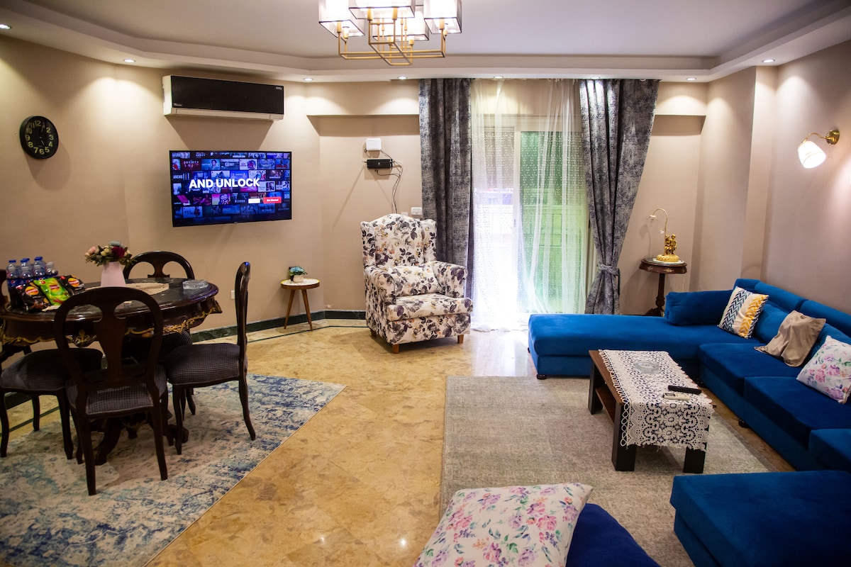 단기 및 장기 숙박에 적합한 숙소에 오신 것을 환영합니다. 저희의 넓은 침실 2개의 아파트는 카이로 공항에서 단 5분 거리에 있습니다. 마스터 침실에는 킹사이즈 침대와 어린이를 위한 아기 침대 (0 ~ 8세) 가 있습니다. 두 번째 침실에는 중형 침대 2개가 있습니다. 50인치 TV (넷플릭스 포함) 완비된 주방에는 가스레인지부터 전자레인지와 주전자까지 필요한 모든 것이 완비되어 있습니다. 아름다운 나무 전망을 감상하며 발코니에서 휴식을 취하거나, 1분만 걸으면 현지 슈퍼마켓, 베이커리 등이 나옵니다.