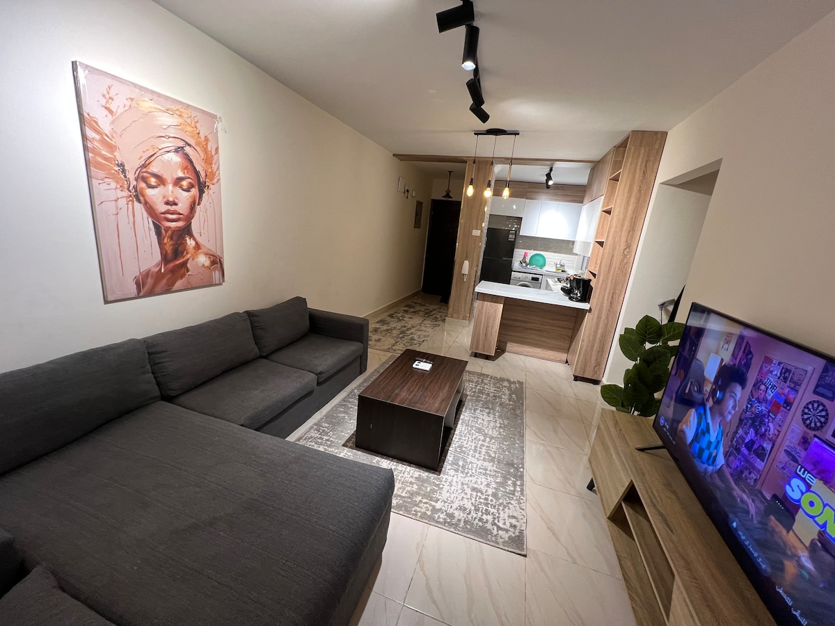 숙소에서 제공하는🌟 사항 • 최대 4명🛏 숙박 가능(편안한 침대 + 소파 침대) • ❄️ 에어컨 완비 및 신형 가전제품 • 💻 광섬유 초고속 인터넷 – 업무 및 스트리밍에 적합 • 🍳 세련된 바 테이블이 있는 완비된 주방 • 아늑한 거실 공간에📺 50인치 스마트 TV • 수에즈 로드에서🚗 단 4분 거리 – 도심으로 쉽게 이동할 수 있습니다. • 🏡 평화롭고 친절한 동네