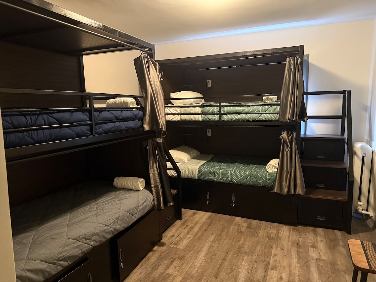 Enjoy the glamour of this stylish, upscale place. Traveling with friends or flying solo? Our 4-Person Shared Rooms offer the perfect blend of comfort, convenience, and community. Each key card-accessed room features two sets of our premium, ultra-comfy bunk beds—complete with privacy curtains, personal reading lights, power outlets, and secure lockers underneath for your belongings. Say goodbye to wobbly ladders—our easy-access stairs to the top bunks make getting in and out a breeze.