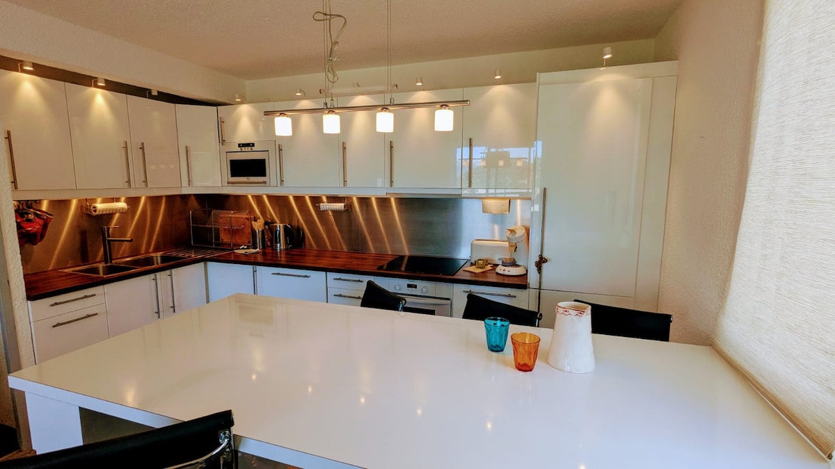 아름다운 아파트는 160cm 너비의 편안한 침대가 구비된 두 개의 큰 침실과 넓은 욕실로 구성되어 있습니다. 20m2의 테라스에 연결된 매우 넓은 거실과 주방은 현대적인 가구로 꾸며져 있습니다. 호수, 산, 수영장의 전망은 가장 까다로운 사람들을 기쁘게 할 것입니다. 공용 공간: 지상층에 차량 2대용 차고. 휴식 공간, 테이블 축구, ps3 게임 콘솔이 있는 TV, 탁구대. 헬스장 및 스파.