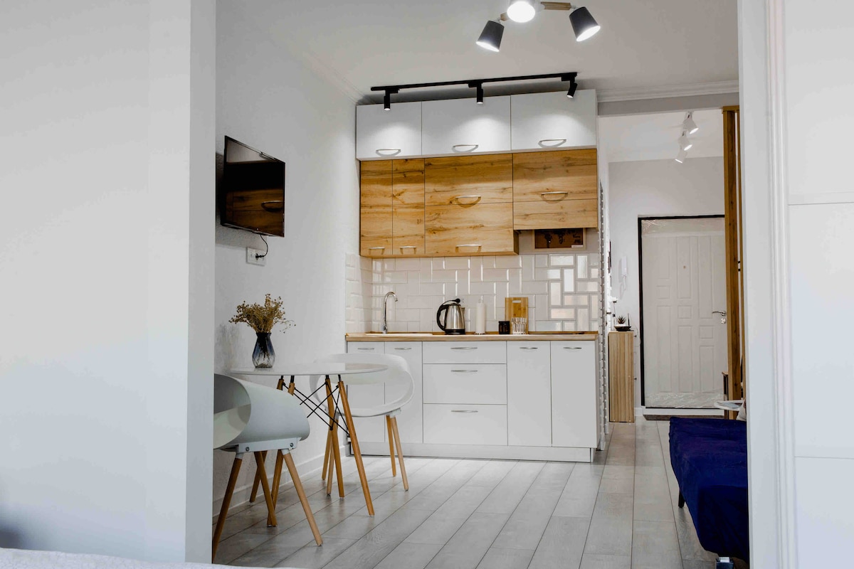 Studio flat of 50m2 with a panoramic window in the new business class residential complex Arbat. The flat has a beautiful view of the city and side views of the mountains. - The flat has Smart TV and means you can connect to your favourite online streaming. - The house is located in the Golden Square, a historic centre and a point of attraction for visitors and residents alike for great walking tours.