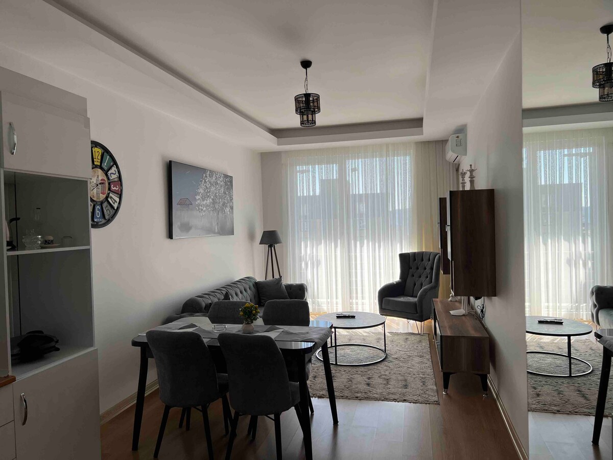 중심지에 위치한 이 아파트에서 편안한 경험을 즐기세요. 거실에 퀸사이즈 침대 1개와 풀아웃 소파 베드가 있어 3명까지 숙박할 수 있습니다. 거실과 침실에 에어컨이 있습니다. 와이파이와 스마트 TV(활성화된 아마존 프라임 계정으로 무료로 영화를 볼 수 있습니다)가 있습니다. 폐쇄된 주차장. 중앙 위치로 E-6 고속도로에서 3분, E-5 고속도로에서 8분, TUYAP에서 14분 거리에 있습니다. 도보 거리 내에 버스 정류장이 있습니다.