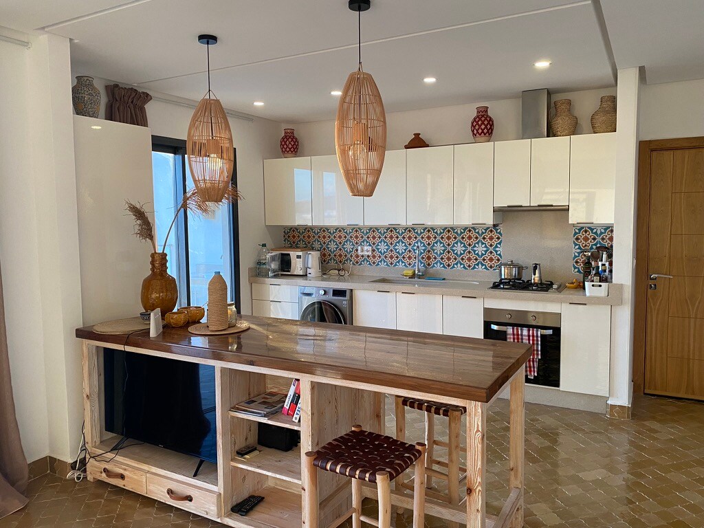이 매력적인 호텔 1층에 위치한 에바 아파트에는 침실 2개, 주방 1개, 욕실 1개, 거실 1개가 있습니다. 이 호텔은 또한 각 여행자가 숙박을 최대한 즐길 수 있도록 바다 전망의 테라스, 라운지 및 공용 주방을 포함한 많은 공용 공간을 제공합니다. 호스트인 메리엠은 공용 테라스 또는 호텔 라운지에서 아침 식사(1인당 60dhs)를 제공합니다. 수건이 제공됩니다.