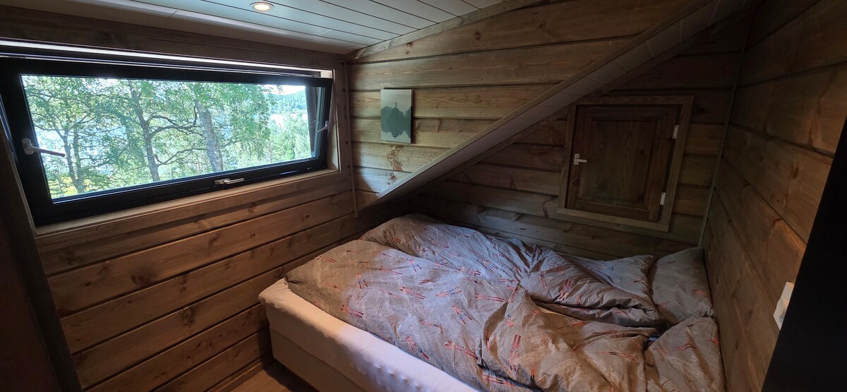 Small cabin, 52 sqm, sunside terrace exposed to sun all day. Wide view over lake Høvringen. 30 m from parking, but hidden from the road. Old-fashioned, simple, but good cabin standard: indoor biological toilet, cold tap water in kitchen, electric stove for cooking, cooler and freezer. Wood stove and electric oil stove for heating. Personal atmosphere, with relativelhy old, well-kept furniture. Lovely bird-singing around.