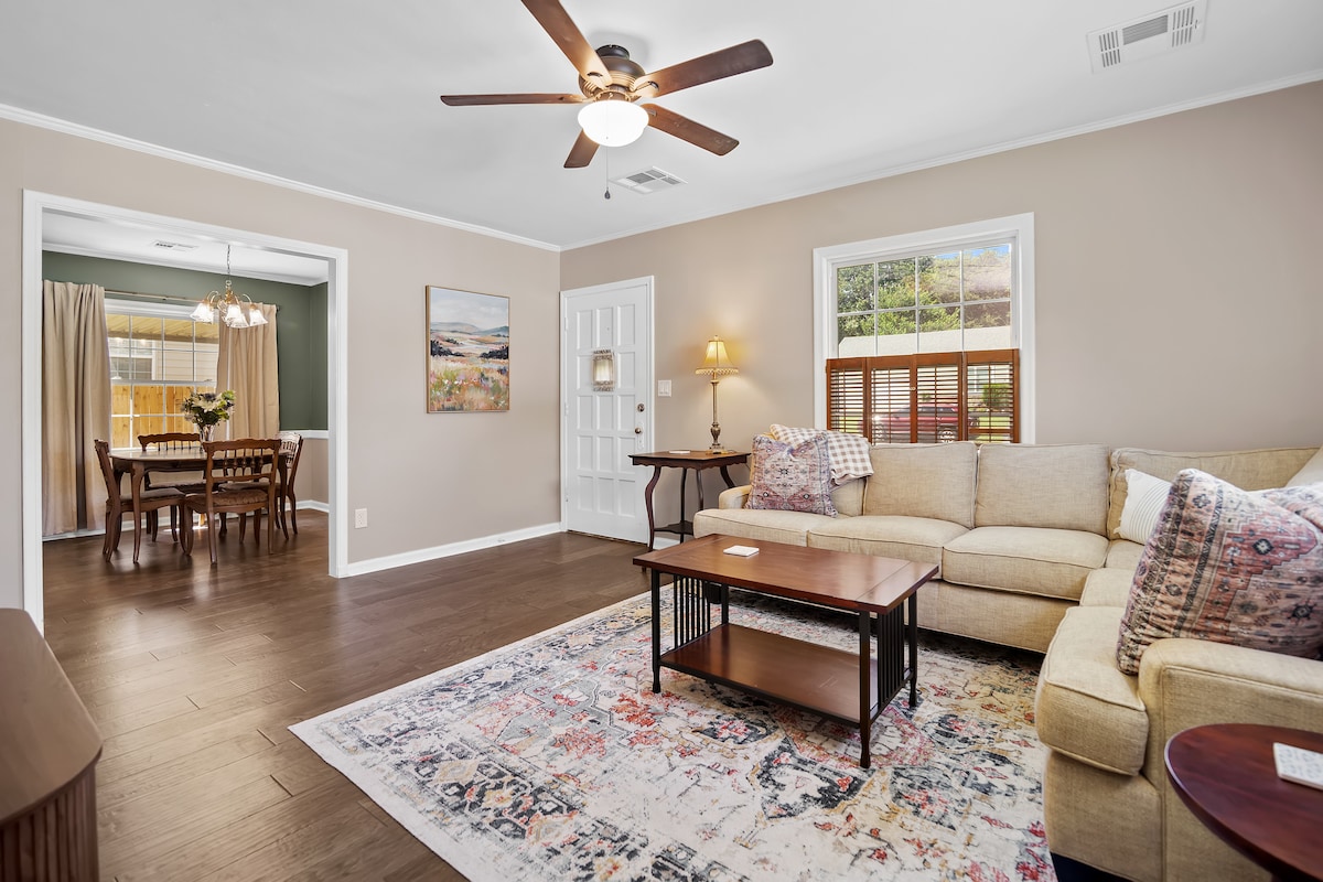 A few houses from Midtown’s pickle ball courts, you’ll find the Ivy Cottage. Charm and character are the highlight of this adorable property. The oversized sectional is the perfect place to cozy up and watch your favorite show on the Smart TV. Or serve dinner in the dining room with French doors that open to the patio. In the back you’ll find a hot tub, smart TV, couch, dart board, wine fridge, cornhole, etc. Plush beds await when you’re ready to call it a night. *Fireplace is not working.