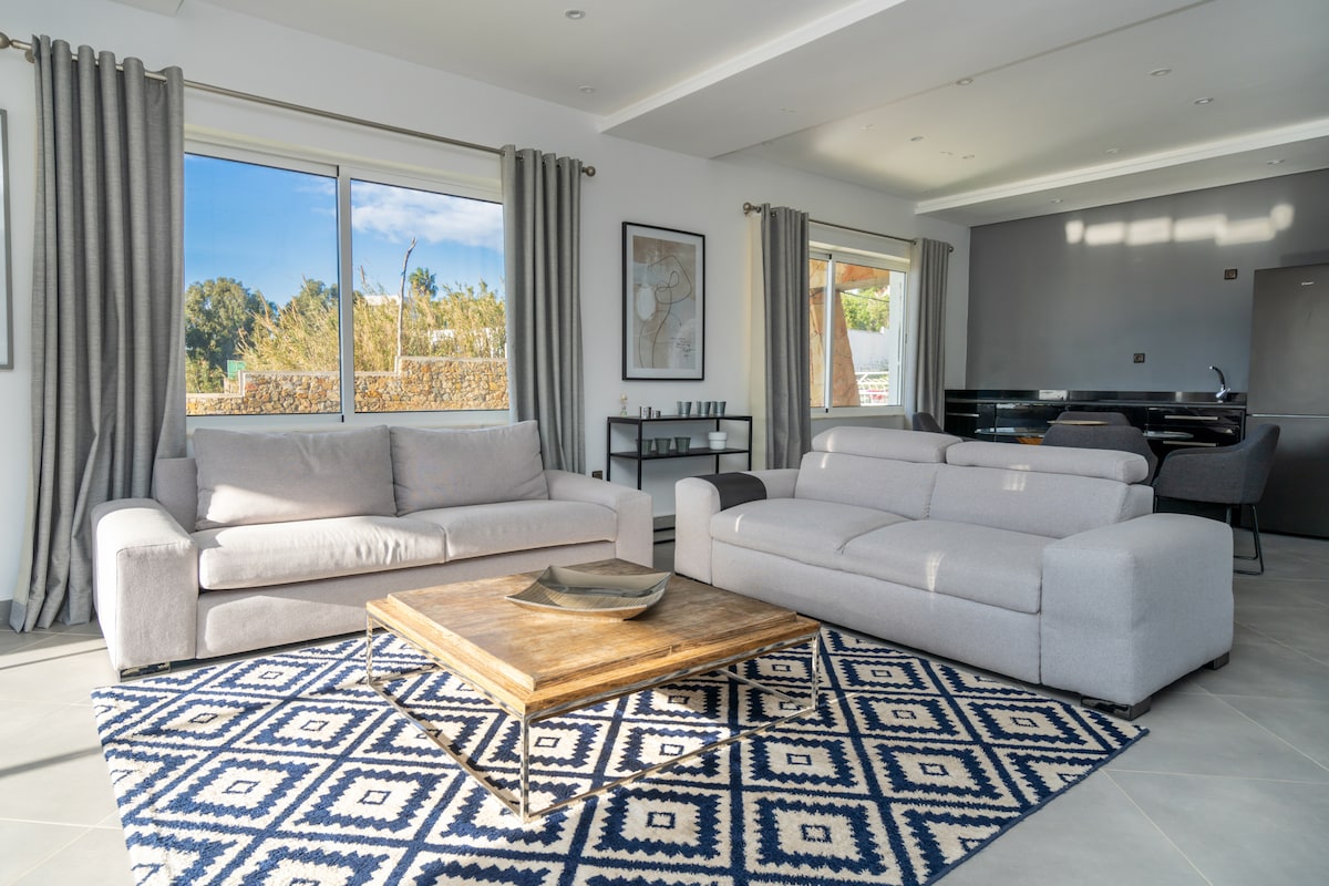 파도 소리에 잠에서 깨어나 지중해, 탕헤르만, 심지어 스페인까지 내려다보는 멋진 전망을 즐겨보세요. 인기 있는 말라바타에 위치한 이 2BR 해변 아파트는 모든 객실에서 파노라마 전망을 즐길 수 있으며, 테라스, 해변으로 바로 연결, 완비된 주방, 스마트 TV, 초고속 와이파이, 에어컨, 게이트 주차장을 갖추고 있습니다. 카페, 빌라 해리스 공원, 모가도르 호텔까지 도보로 5분 거리에 있습니다. 그랜드 소코까지 11분 거리입니다. 2층에 ⚠️ 위치해 있습니다(차고에서 60계단). 엘리베이터는 없습니다. 요청 시👶 유아용 침대 및 유아용 식탁 의자를 이용할 수 있습니다.