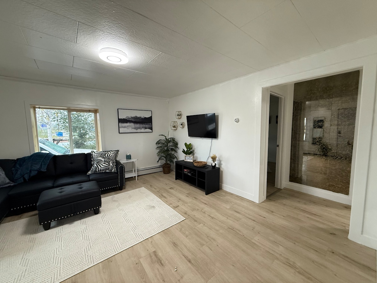 게스트에게 최대의 편안함과 경험을 제공하기 위해 이 현대적인 알래스카 아파트를 새로 지었습니다. 맞춤형 타일 샤워 부스가 있는 편안한 제트 욕조를 즐겨보세요. HD TV로 영화를 보면서 가죽 소파에 눕아 아늑하게 쉬세요. 메모리폼 킹사이즈 침대에서 편안하게 수면을 취하세요. 공항, UAF, 레스토랑, 산책로, 상점, 관광지에서 가깝습니다. 숙소에 세탁기와 건조기가 있습니다! 인스턴트 오트밀, 팬케이크 믹스, 차, 커피 등 아침 식사 아이템을 제공합니다.