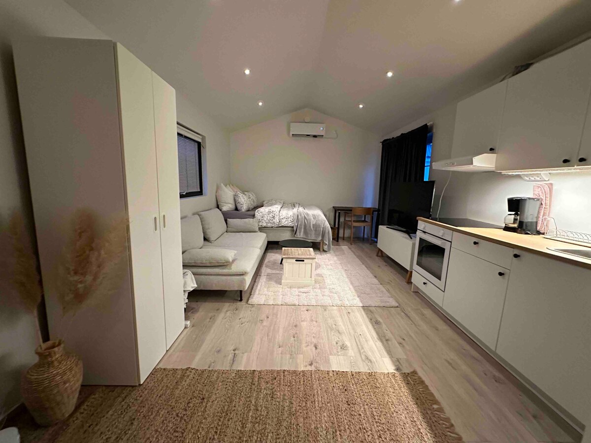 Fresh and newly built studio apartment with a lot of sunlight. - King size bed 210x210 cm - Convertible sofa 145x200 cm The whole apartment is 55 m² and all yours during your stay. - Free parking on the street right outside the house - Grocery store nearby - 2 bus stations nearby. 20-30 min to the city center by bus - 15 min to city center by car If you have any questions, please don’t hesitate to ask!