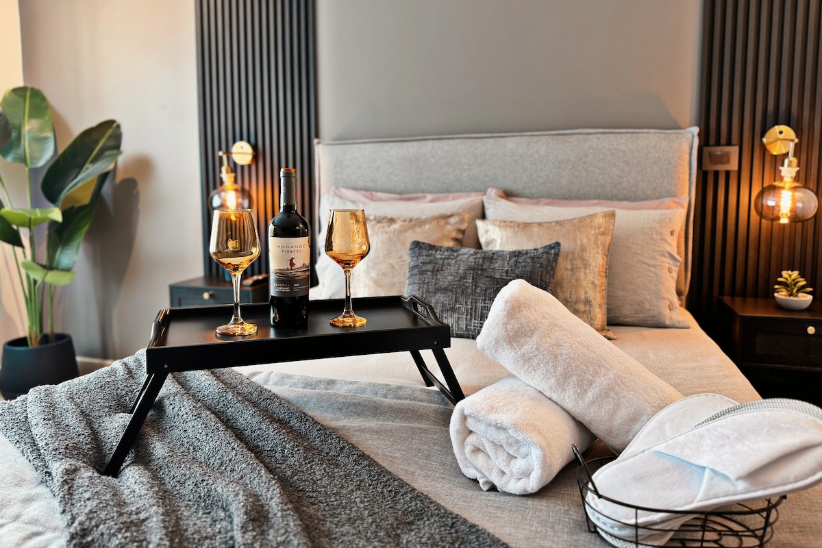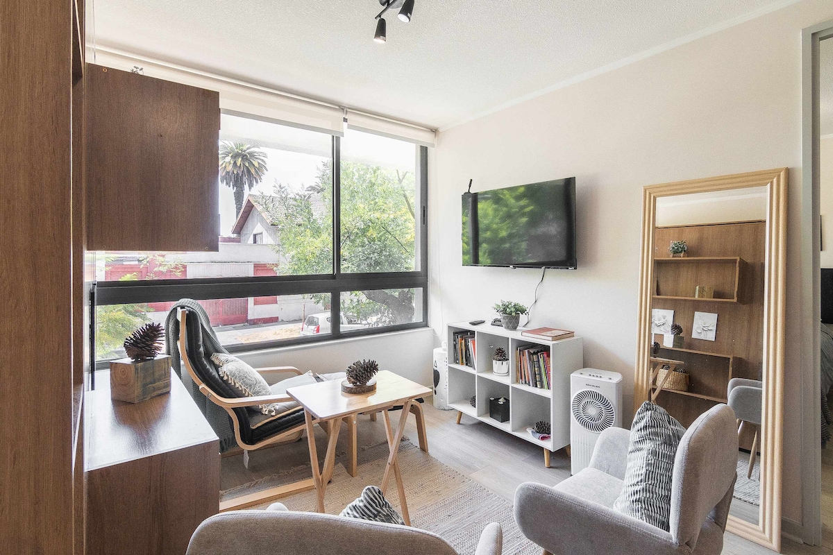 Moderno y acogedor departamento con terraza, piscina, gimnasio y estacionamiento privado gratis. Pet friendly y equipado con accesorios para tu mascota para que también disfrute la estadía. Cuenta con dormitorio matrimonial, sillón cama, aire acondicionado y cocina full equipada. TV en dormitorio y living. Excelente ubicación en Santiago Centro, cerca de parques, comercio y transporte.