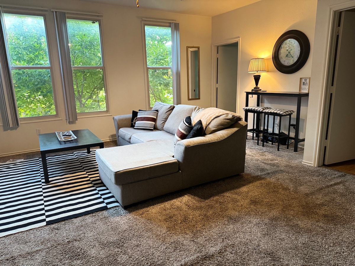 전용 출입구와 욕실이 있는 전용 게스트 스위트. 클레스토리 창문은 풍부한 대낮을 제공합니다. 퀸사이즈 침대가 있는 로프트 스타일 침실. 풀 사이즈 슬리퍼 소파에 추가 수면 공간이 마련되어 있습니다. 안테나와 로쿠 스트리밍 시설이 갖춰진 42인치 TV. 냉장고, 커피, 전자레인지, 인덕션 쿡탑이 갖춰진 간이 주방이 있습니다. 커블레스 샤워실과 벽걸이 화장실을 갖춘 유럽 스타일의 욕실. 무제한 뜨거운 물을 위한 무탱크 온수기.