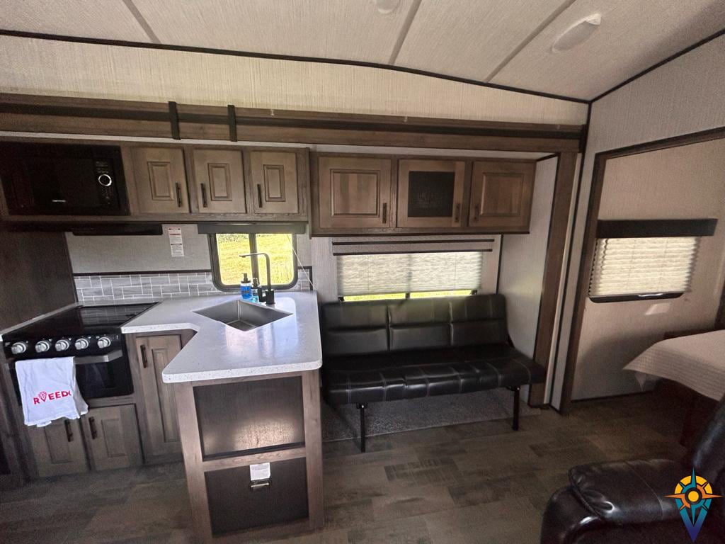 크루저 RV 래디언스 시리즈 M-31은 도로에서 모험을 원하는 여행객에게 넓고 시설이 잘 갖춰져 있으며 편안한 생활 공간을 제공합니다. 여행자를 위한 편안함과 편리함을 결합합니다. 냉장고, 스토브, 오븐, 싱크대, 넉넉한 수납 공간이 구비된 시설이 완비된 주방이 돋보이는 특징 중 하나입니다. 이를 통해 이동 중에도 편리한 식사 준비를 할 수 있습니다.