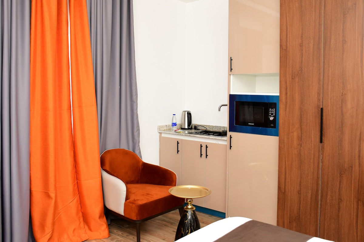 Experience a blend of class, intentional furnishing and space for your maximum comfort in my Attic Studio Apartment. The stairway leading to the Attic exudes Royalty and magnificence; overseeing a play ground replete with table tennis, snooker board, TV game corner, Gym and a Pool. It runs sustainably on a solar powered inverter, standby generator and a relatively stable power supply as a compliment. Apartment has air conditioning unit, water heater and a fully equipped open plan kitchen