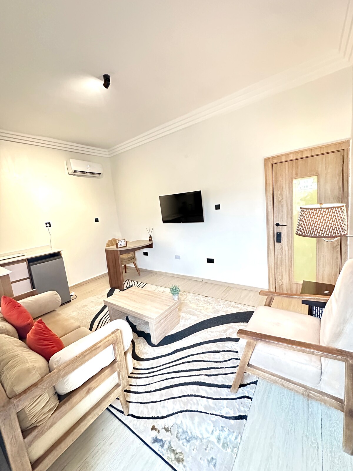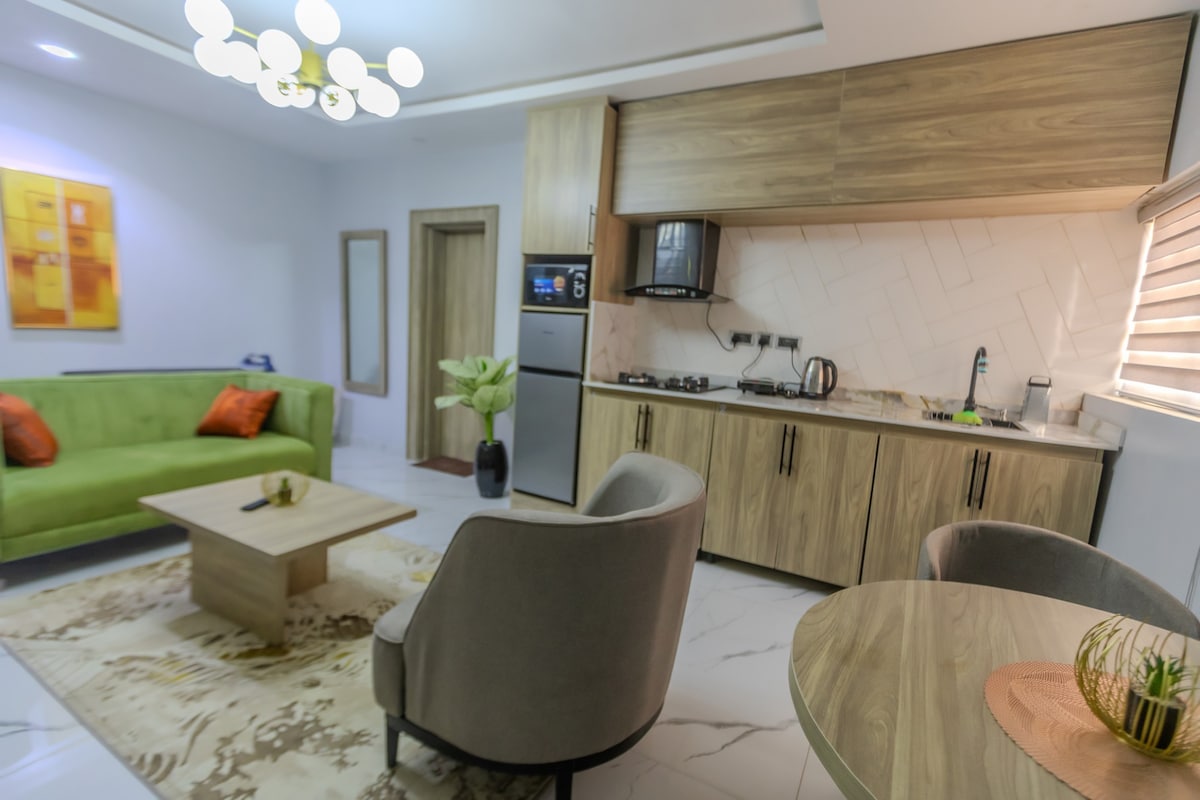Escape the hustle of the city in this spacious, stylish studio apartment. The contemporary aesthetic of this space is perfect for couples’ getaways or solo travellers It is fully furnished + located in a secure estate. The space is serviced with free, super-fast Wifi & ample parking space The kitchen is fitted with modern equipment for your convenience. With 24/7 electricity, our smart TV & other luxurious amenities make this a home away from home, with the trappings of a dreamy hotel suite.