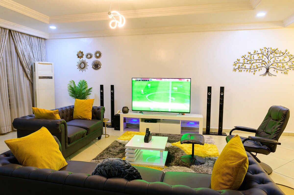 Forget your worries in this spacious and serene space. This home is newely built (2021) and fully furnished! Less than 30 minutes from Abuja Airport! Here are a couple of amenities that are included in the home: * Solar power * Security Staff * Washer and Dryer * Wireless Internet * Indoor Bar * New Kitchen w latest appliances * Flat screen TV in each room * Full bathroom for each room with shower w/ detachable shower head * Private residence with gate * Staff on-site to assist you when needed