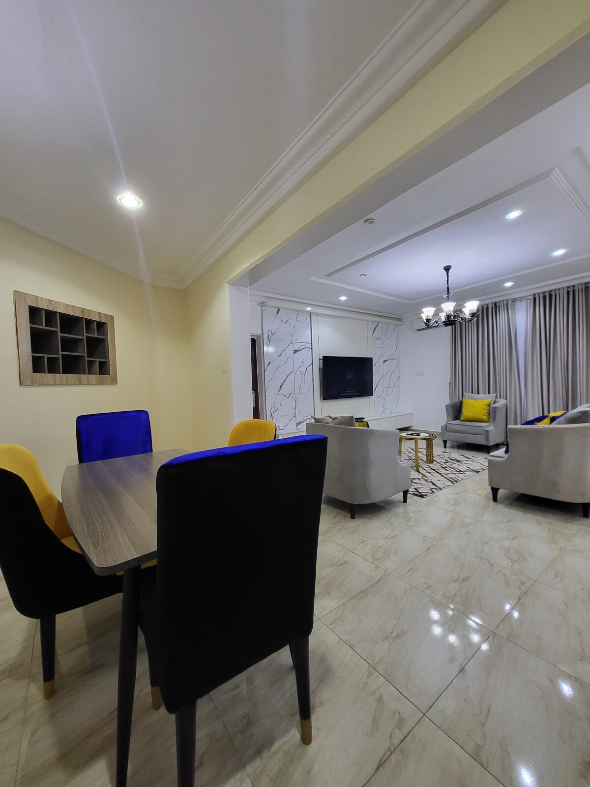 코드가 있는 문 전용 발코니 세탁기 침실 3개가 있는 아늑한 공간 에어컨 5개 전용 업무 공간 가구가 완비된 거실 주방 시설 완비 화장실 4개 및 욕실 3개 스타링크 & 광섬유 와이파이 연중무휴 조명 (태양광 | 인버터 | 세대) 전력망이 없는 경우: 발전기: 오전 6시~오전 8시, 오후 6시~오전 12시, 인버터는 항상 켜져 있음. 시장, 나이트클럽, 레스토랑, 상점과의 근접성 깨끗하고 깨끗한 침구와 수건 고요하고 안전하며 아름다운 동네 85인치, 65인치, 50인치, 50인치 스마트 TV(프라임, 넷플릭스)