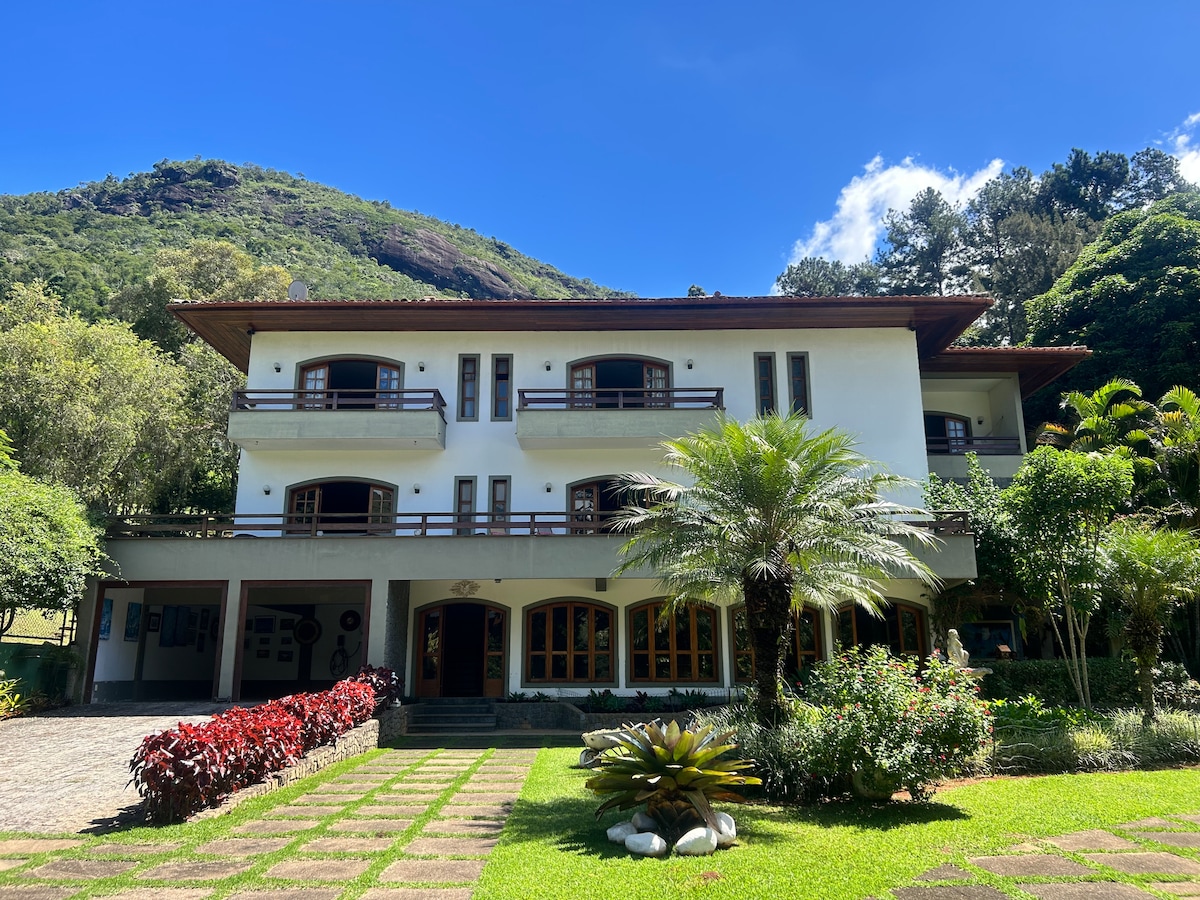 Casa confortável com 5 quartos, 3 salas, piscina, sauna, jogos e campo. A 2km do centro de Itaipava, perto de tudo.