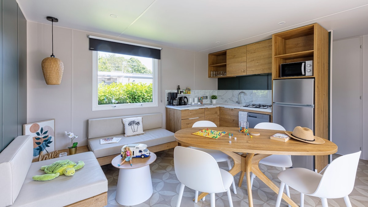 Mobil-home neuf,6 personnes 3 chambre, 1 avec lit double dressing, 2 autres chambres avec 2 petits lit chacune. 1 salle de bain, 1 WC, 1 douche italienne. terrasse couverte et fermé. le mobilhome se situe sur le Domaine de Kerlann au camping siblu avec c'est 3 piscines chauffée dont 1 couverte. bar, restaurant, supérette et de nombreux activités, club enfants etc. basket, boule, tennis, tir à l'arc. ATTENTION prévoir fun pass animations à partir avril, tarif joint.