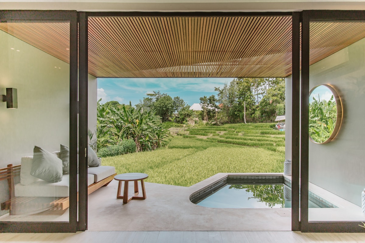Experience a spacious getaway with rice paddy views, unwind on the patio and plunge into your private pool. A secluded space just minutes by scooter from the beach, cafés, and shops, yet feeling a world away in this peaceful oasis. ֍ Private dip pool & hanging net overlooking breathtaking views ֍ Daily cleaning & service staff assists with things like scooter hire ֍ Just minutes by scooter to restaurants, bars, Bali Social Club and beaches ֍ 102 m2/1080 sq ft spacious getaway