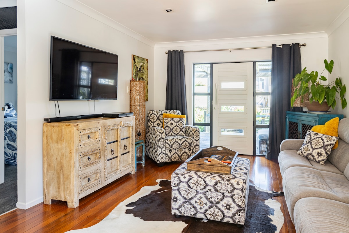 Fabulous on Thames coast. Stylish, well appointed 1 bedroom cottage, open plan living, dining, kitchen with direct access to lovely outdoor relaxation areas. A quiet haven off the main road, only 100 mtrs easy walk to beach reserve and fishing. Enjoy the birdsong, sunrise and daytime hours in the shady, tropical garden at the rear of the house with its generous outdoor seating and dining facilities, and take in the sunset from the deck and coastal garden in the front of the house.