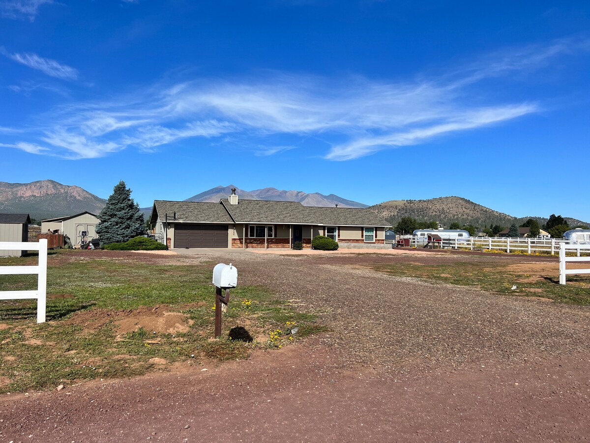 2.5에이커의 울타리로 완전히 둘러싸인 목장에서 숨 막히는 산 전망을 감상할 수 있는 현대적인 카시타에서 몸을 풀고 휴식을 취하며 더위를 피하세요. 애리조나 스노우볼, 플래그스태프 시내, NAU, 베어리조나, 노스 폴 익스피리언스, 그랜드 캐니언, 세도나, 국립 기념물, 사냥, 하이킹, 오프로드 등 애리조나 북부의 모든 것을 즐길 수 있는 중심지에 위치한 이 평화로운 숙소를 쉽게 이용하실 수 있습니다! 더 많은 공간이 필요하신가요? 로벳 로지와 함께 예약하시면 숙소 전체를 단독으로 사용하실 수 있습니다!