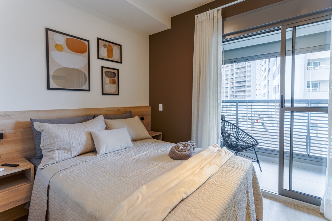 Boutique studio with one of the most beautiful views of São Paulo city. Placed 2 minutes walk from the subway. Fully equipped kitchen with refrigerator hidden by wooden door. Wi-fi, air-conditioning and smart TV 55 inches. Self check-in with smart electronic lock. Play tennis or go o gym and relax in the pools (outdoor or heated indoor) and saunas (wet or dry) afterwards. Common area also includes co-working spaces and laundry. Visitors need to be previously registered at the front dest.