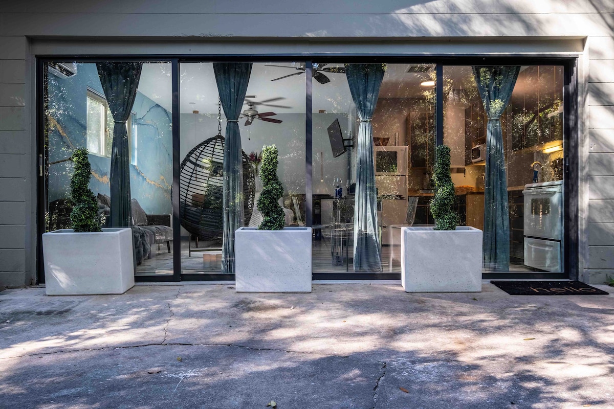 The Studio is a private guest suite featuring luxury amenities. This open-concept retreat is centrally located with a private courtyard. Inside, enjoy a blend of modern and mid-century design, with glass sliders that create an inviting indoor-outdoor feel. Amenities include an LED vanity mirror, stainless steel towel warmer, Bluetooth speaker, glass dining table, convertible sleeper sofa, suspended pod chair, and Google Home display for added convenience.
