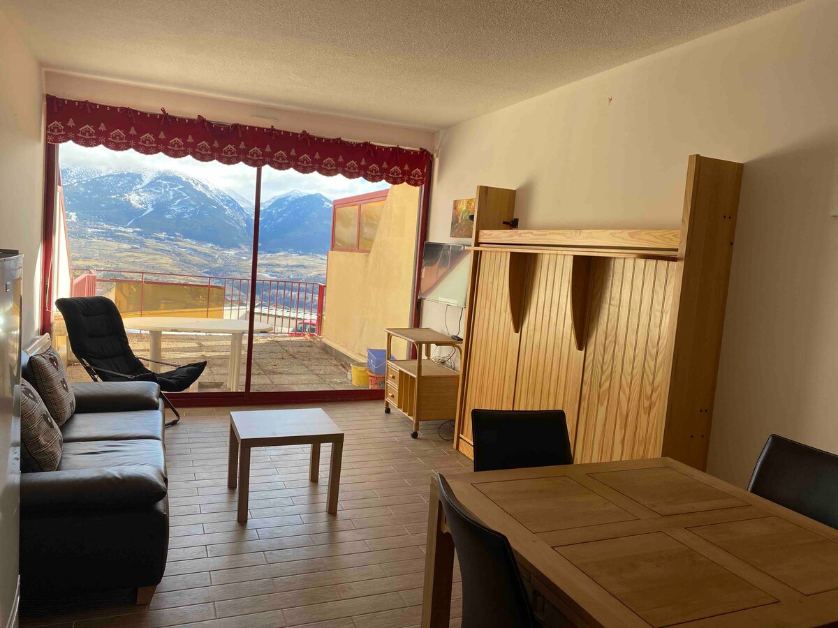 Ce logement familial est proche de tous les sites et commodités. (Même rue que carrefour contact, boulangerie et boucherie…) Dans lhypercentre de font romeu, au calme. Belle terrasse avec vue sur montagne. L’appartement de 35m2 se compose de la manière suivante: Salon séjour avec cuisine entièrement équipée :lave vaisselle,lave linge fonction séchante, nespresso, cafetière… Canapé , vrai lit escamotable deux personnes Télé et wifi Une salle de bain avec wc Une chambre avec lits superposés