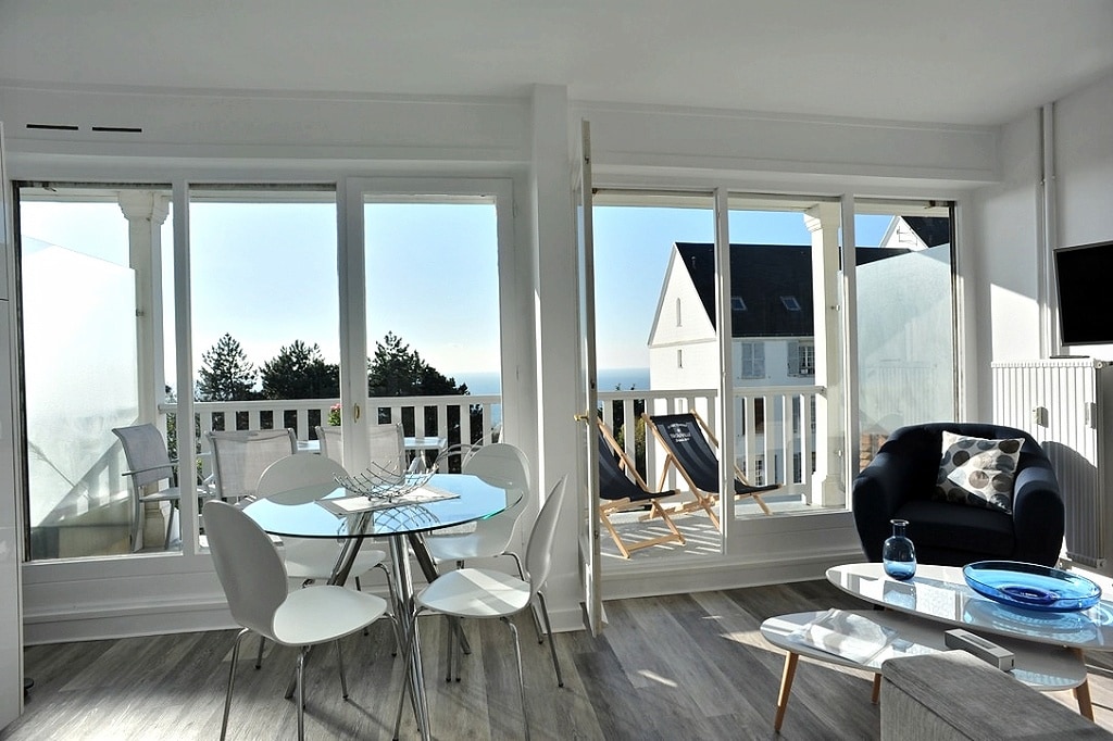 Très beau studio avec grande Terrasse Vue Mer. Situé dans une résidence à 10 minutes à pied du Centre de Trouville et de la Mer. - Entrée avec rangement - Séjour avec lit armoire grande largeur (160 cm) et matelas de qualité hôtelière, canapé vue mer, table basse, fauteuil de détente, TV Cable. WIFI. - Terrasse exposée Ouest (soleil l'après midi jusqu'au coucher du soleil que vous pourrez contempler depuis la terrasse) - Cuisine équipée - Salle de douche avec grande vasque, W.C.