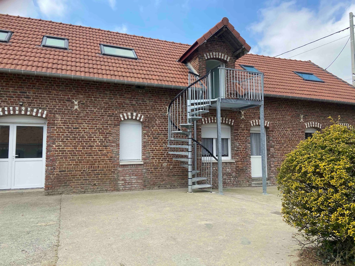 Studio à l étage situé dans un bâtiment de ferme donnant sur une cour accès par un escalier en colimaçon situé dans la cour d'une ferme en activité ,sur l'axe Cambrai /Bapaume: 15min de Cambrai et 15 min de Bapaume ,35min de Douai et 30 min d'Arras en voiture ,dans un petit village à la campagne. Possibilité de garer le véhicule dans la cour fermée, studio neuf, spacieux , Idéal pour 2 personnes. Animaux acceptés; nous avons trois gentils chiens à la ferme ainsi que des chevaux.