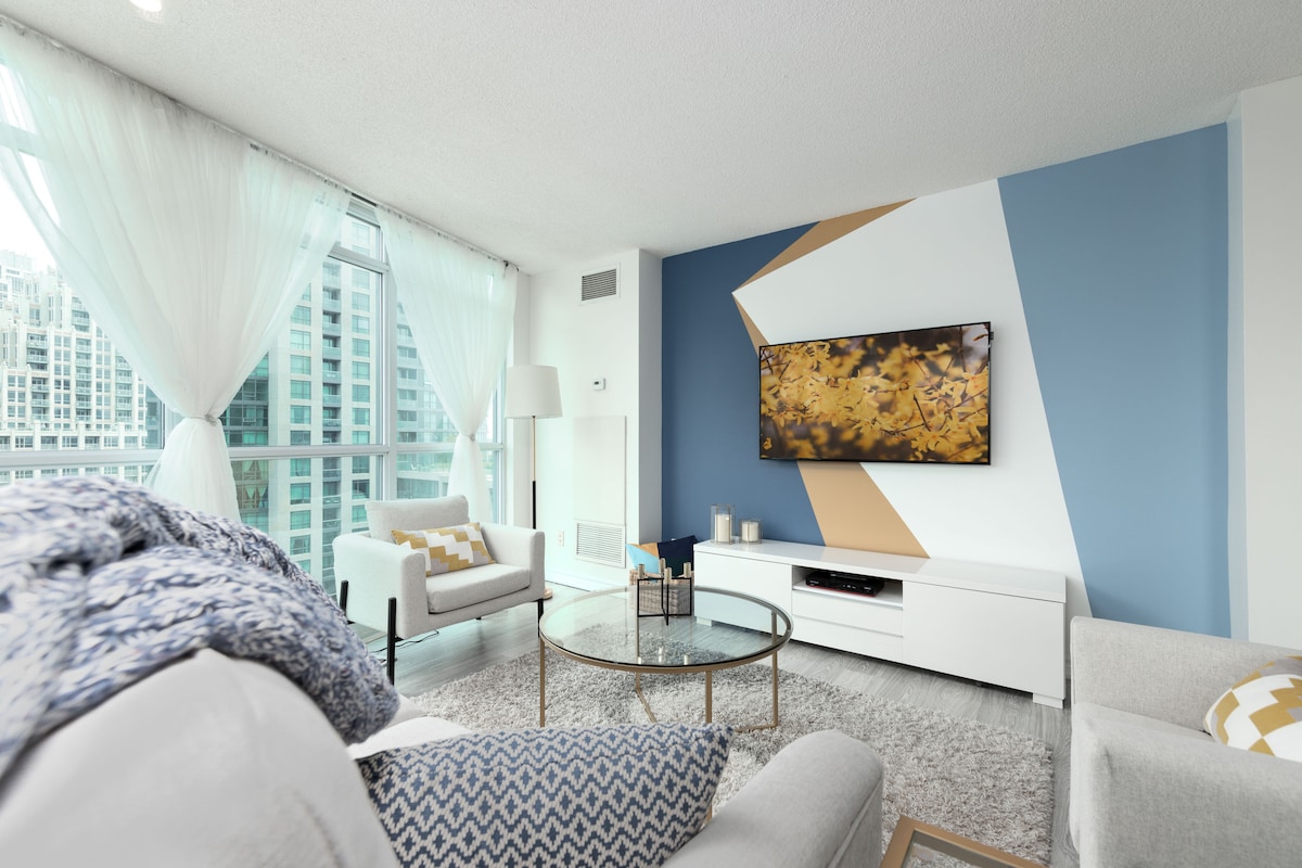 CN 타워 전망을 감상할 수 있는 세련된 고층 아파트