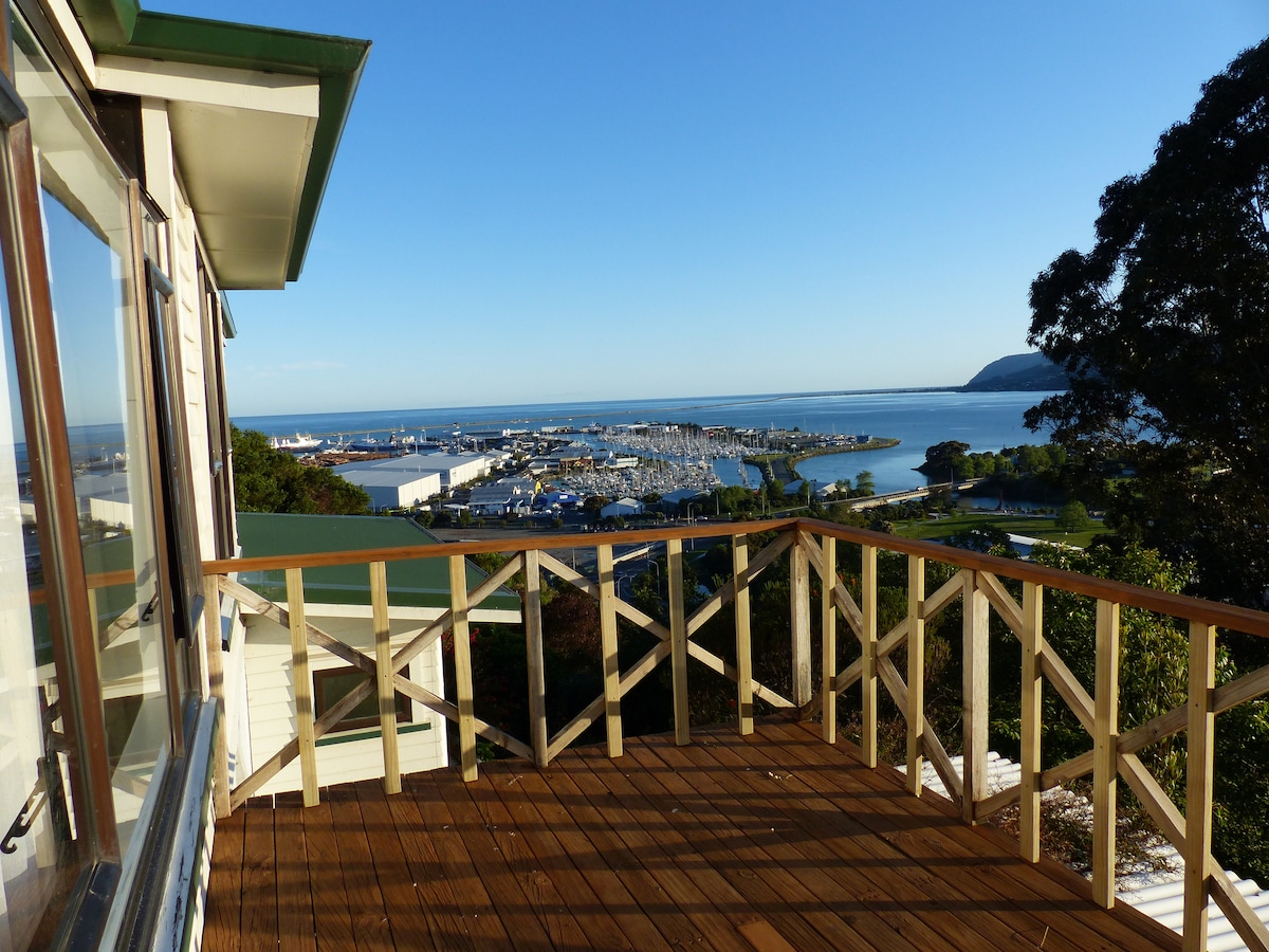 No smoking within the property please. The unit is ideal for short stay visitors who are happy to dine out. Air fryer, Electric fry pan, Microwave, electric jug, cutlery, plates etc. Tea, Coffee, Milk, Juice and Breakfast cereal provided. Dining table but no washing machine. Compact, Self contained, clean, quiet, comfortable and 10 mins walk to City Centre. Surrounded by trees but still has a unique uninterrupted view of the Port and City.