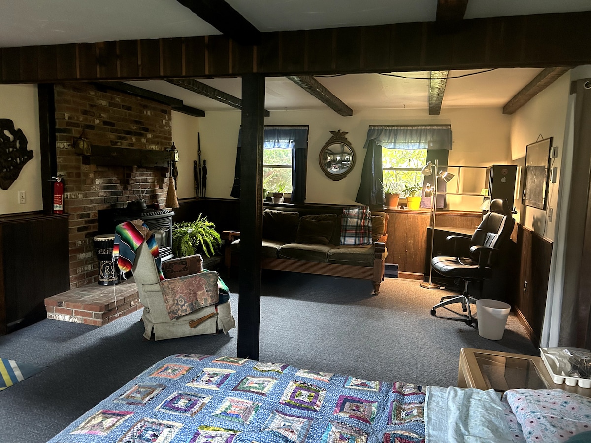 Wake up among 100-year-old trees, then drive ten minutes into Amherst for museums or sushi. Or hike out the door toward wooded trails. The apartment sits with our house on 5 acres of mature forest. With a kitchen & washer/dryer, the apartment is peaceful and practical, ideal for a weekend getaway or an extended stay, great for academics needing space for contemplation or for a couple visiting family. (Read about the steep driveway if planning a winter trip.)