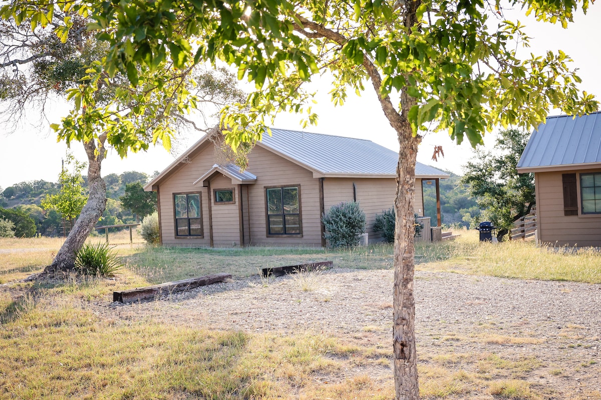Unique luxury one-bedroom guesthouses on the Pedernales River in Johnson City. Perfect for a memorable getaway to the Texas Hill Country and wine trail. Beautiful view and river access. Each house is ~650 sq. ft., with king bed , modern bathroom, a living room/fully equipped kitchen, and an outdoor patio. Airbeds can be provided to sleep up to two more, or two couples could rent both houses. Stairs take you down to the river. No pets. Free Level 2 EV charger (Tesla and J1772). No cleaning fee.
