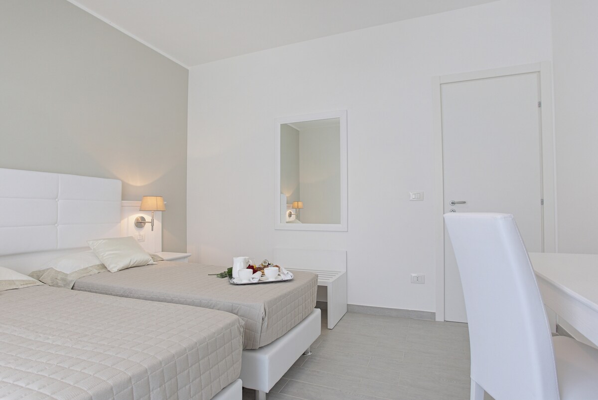 아늑한 싱글룸, 혼자 여행하는 여행객에게 이상적입니다. 심플함과 세심함으로 가구가 배치되어 있으며, 편안한 침대, 에어컨, 와이파이, 전용 욕실과 같은 필수적인 편안함을 제공합니다. 바다 전망은 없지만, 바다와 고고학 공원에서 몇 걸음 거리에 있는 호텔 내부에 있어 평화롭고 편안한 숙박을 즐기기에 완벽합니다.