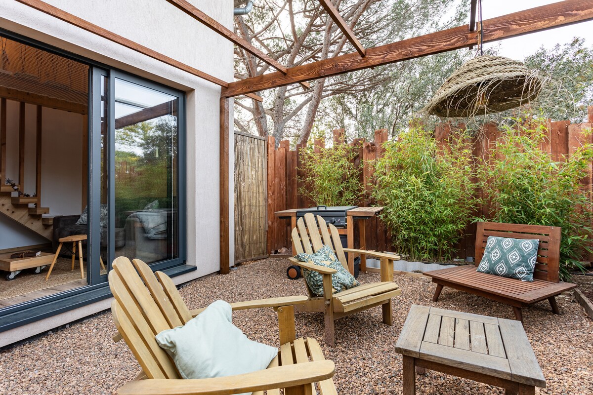 Niché dans un espace arboré, ce studio de 30m² en bois massif a été construit dans le prolongement d’une extension de maison. Il dispose d’un jardin privatif et d’une place de parking. Calme, apaisant et tourné vers l’éco-responsabilité, ce cocon invite au repos. À 5 min en voiture des plages, du massif de l’Esterel et du centre-ville, vous pouvez aussi emprunter nos vélos et rejoindre la mer par les pistes cyclables.