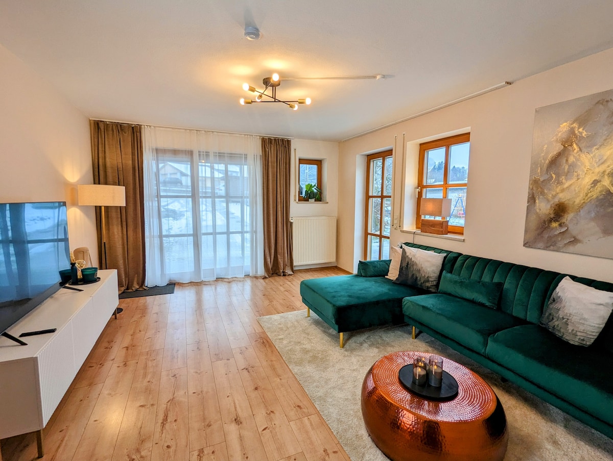 Enjoy quality time together in our 256 m² penthouse featuring a rooftop hot tub and an XXL panoramic terrace. Relax in the warm water while taking in stunning mountain views and the neighboring Penninger Distillery. Perfect for families and groups seeking comfort, nature, and relaxation. With the Saußbachklamm trail just steps away, it’s the ideal starting point for exploring the Bavarian Forest.